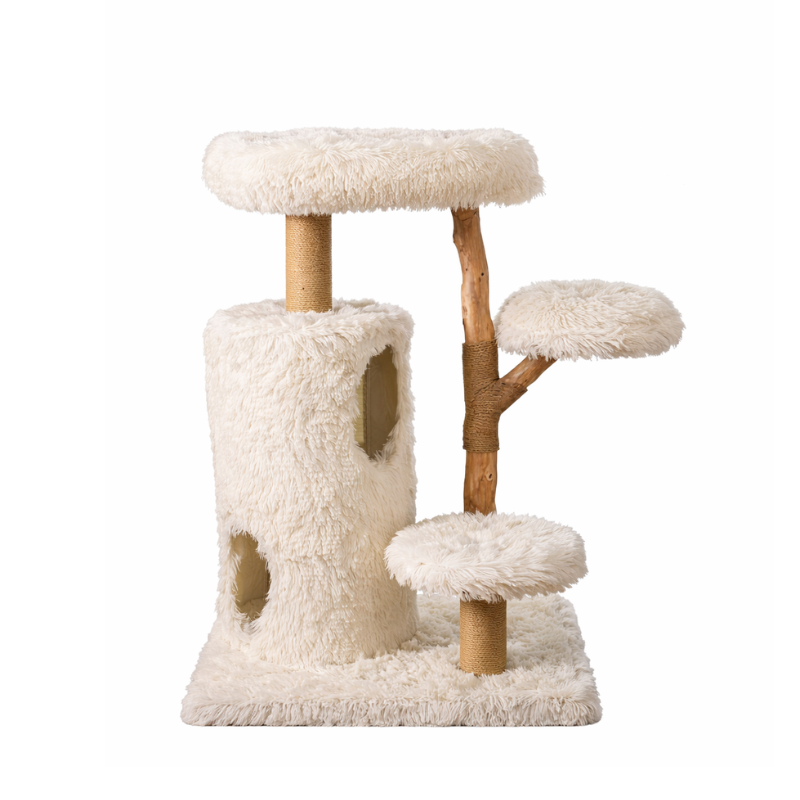 Nos produits utilisent des matériaux courants pour ce type d’équipement, comme le bois composite, le tissu et le sisal pour les zones de griffade.