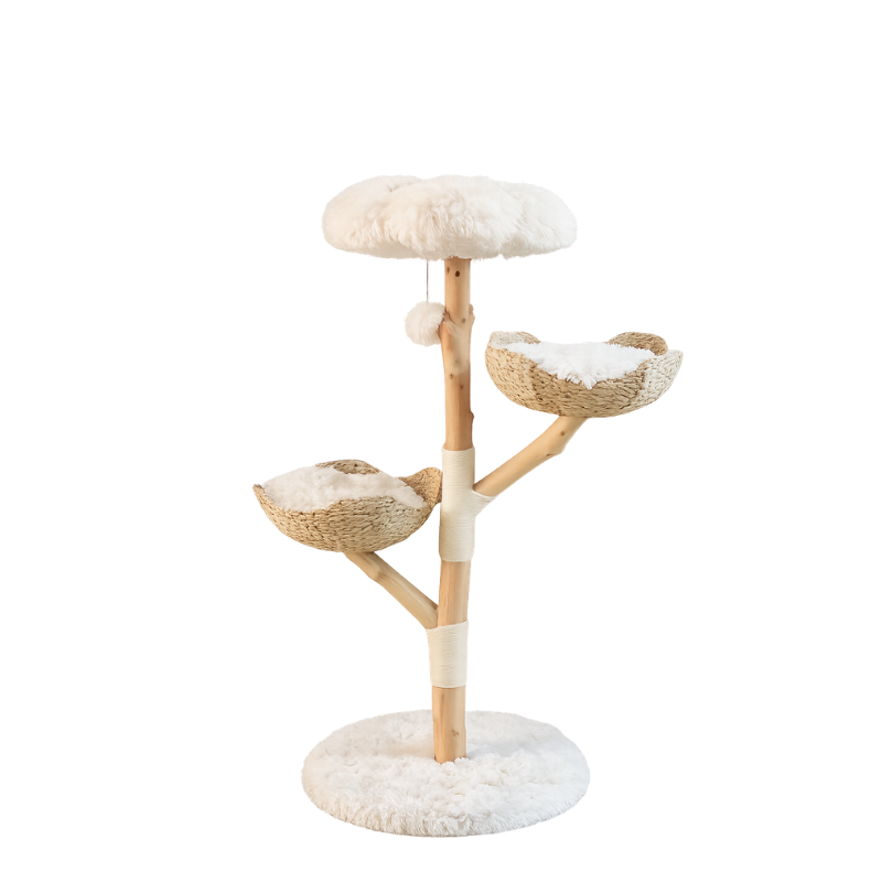 Le Felineo ArboNest Plus est un arbre à chat conçu pour offrir plusieurs zones de repos et d’accès en hauteur. Sa structure combine un support en bois naturel, des plateformes textiles et des paniers tressés positionnés à différents niveaux.